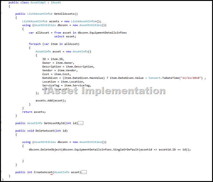 Now Define the WCF Service & Operation Contracts and Implement the Operations Contracts. My Asset Table have lot of columns so i have created Data contract with only selected columns and named as AssetInfo.